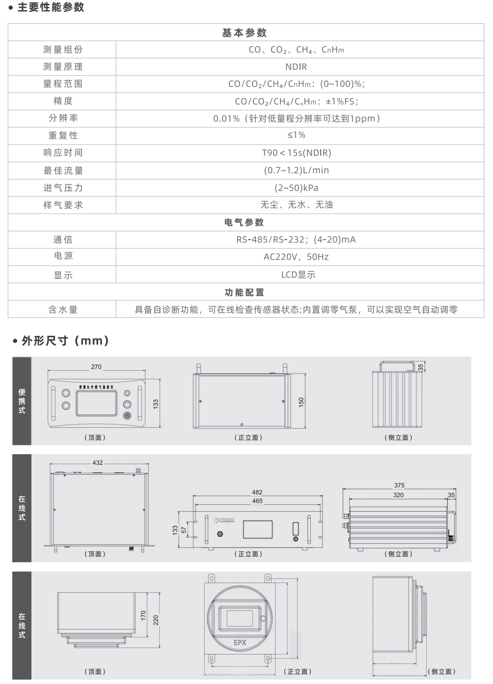 采用进口NDIR非分光红外传感器,长寿命电化学传感器和基于MEMS的热导传感器,运用先进的数字处理技